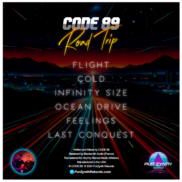 French Synthwave duo CODE 89🌴 is back in their new EP: ROAD TRIP. Second one published by PurZynth Rekords is an exquisit collection of 6 tracks, featuring smooth secuencing melodies among beachy atmospheres enhanced by female chorus, perfect for listening on a starry night or while traveling at the highway in their mediterranean Dreamwave style from the dephts of Nantes, France.